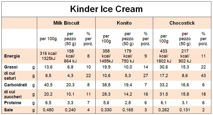 Nella lista degli ingredienti proposta in etichetta ci si perde, ma non c’è niente di strano trattandosi di gelati industriali composti da più elementi (biscotto, cialda, cioccolato). Nel caso specifico, leggere le etichette di Kinder Ice Cream è davvero un’impresa difficile visto che l’elenco degli ingredienti è riportato utilizzando caratteri tipografici piccoli.