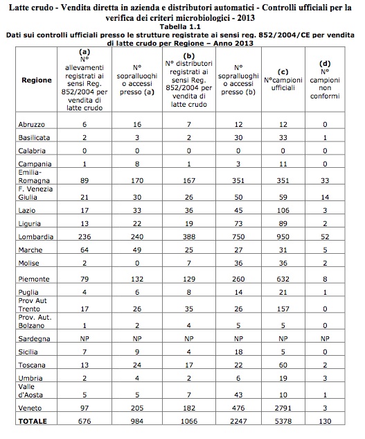 In particolare, per l’anno 2013 risultano registrate presso le ASL locali in tutta Italia un totale di 1742 strutture deputate alla vendita di latte crudo. Gli allevamenti censiti sono 676, mentre i distributori automatici sono 1066. Sono stati effettuati 984 sopralluoghi negli allevamenti e 2247 presso i distributori automatici. I campioni ufficiali raccolti sono stati 5.378 (vedi tabella sotto ). Nel testo si legge che su un totale di 13.526 analisi ufficiali eseguite (più di un’analisi per campione) per verificare la conformità ai criteri microbiologici e ai contaminanti (aflatossina), le non conformità sono state 84. Le criticità più preoccupanti riguardano Aflatossina ed E.coli Verocitotossico.