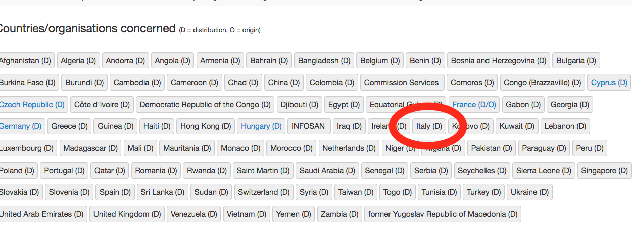 Il sito del Sistema di allerta rapido europeo (Rasff) ha inserito l’Italia tra i 54 Paesi dove è stato commercializzato il latte in polvere ritirato dal mercato (vedi foto sotto) Questo si spiega perché la documentazione trasmessa dalle Autorità sanitarie francesi evidenzia che tre vendite online, per un totale di cinque pezzi, hanno interessato l’Italia. Le stesse Autorità però precisano che l’operatore ha sospeso le vendite e gli acquirenti finali dei prodotti sono stati informati del richiamo.