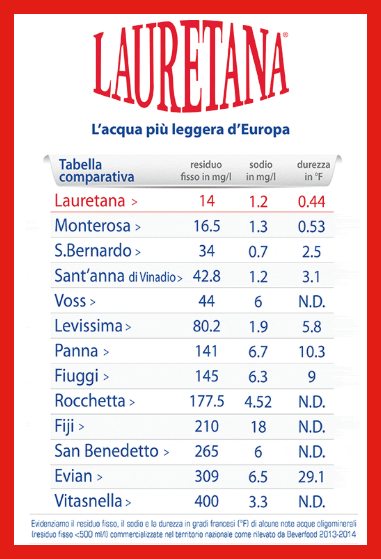 In altre parole, Lauretana certo non presenta il proprio prodotto come panacea di ogni disturbo umano o idoneo ad essere funzionale alle necessità di tutti allo stesso modo, ma ciò non può valere per negarne — in toto — le caratteristiche positive.