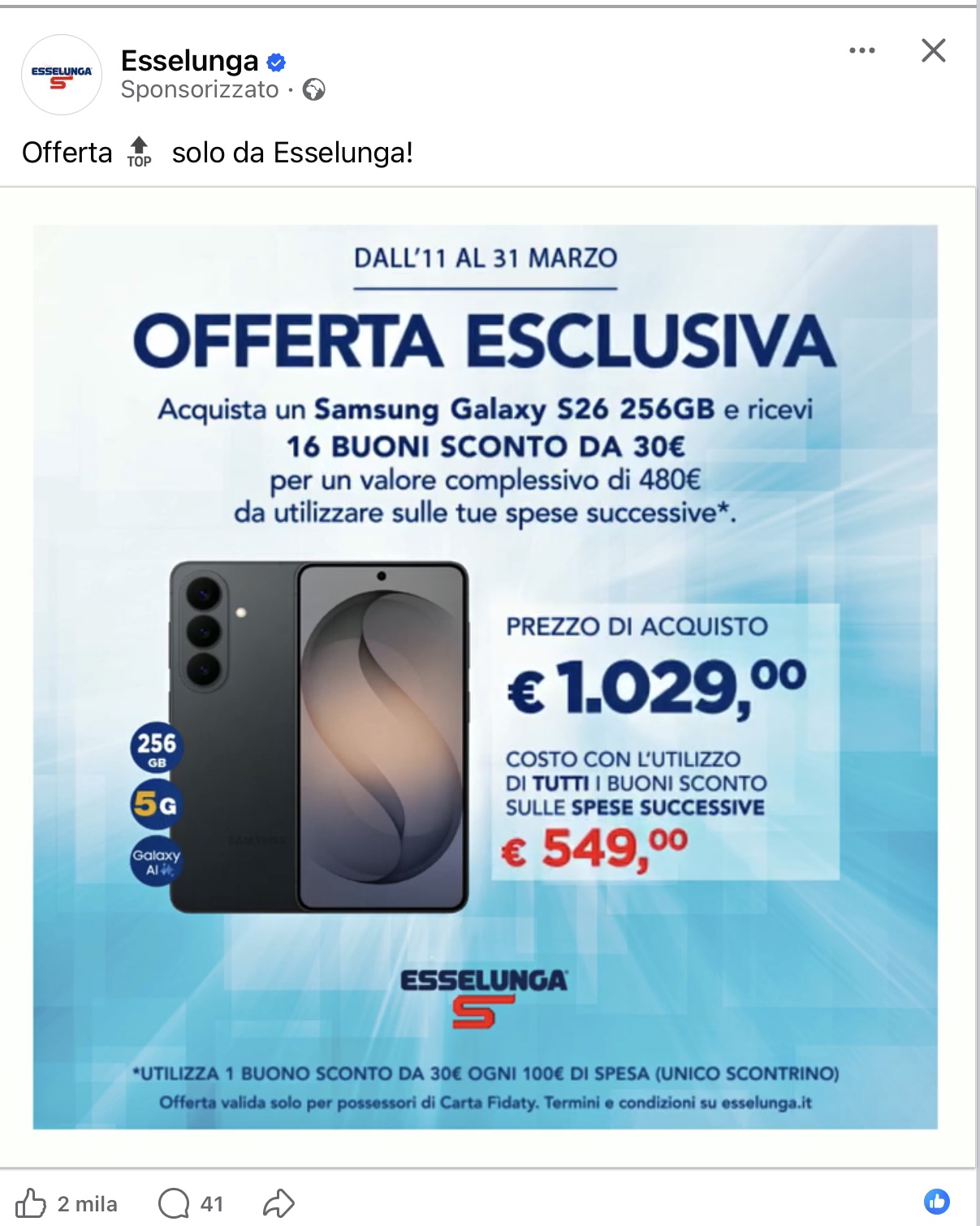 ho notato su Facebook, come inserzione sponsorizzata, questa offerta Esselunga di cui allego immagine (vedi foto sotto): si propone di acquistare un cellulare Samsung Galaxi al prezzo di 1.029 euro ottenendo in cambio 480 euro di buoni spesa Esselunga (16 buoni da 30 euro), arrivando così a dimezzare o quasi il prezzo del telefono.