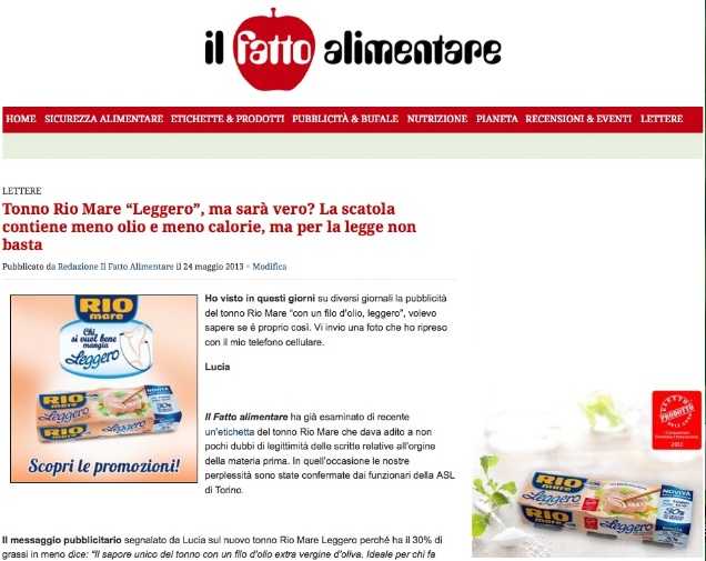 Abbiamo avuto modo di leggere la lettera di una consumatrice, pubblicata lo scorso 24 maggio sul vostro sito, con cui vengono richieste delle informazioni sul “Tonno Rio Mare Leggero” e la relativa risposta da parte dell’esperto di diritto alimentare Franco Gentile che discute in merito alla correttezza dei messaggi attraverso i quali il prodotto viene promosso.