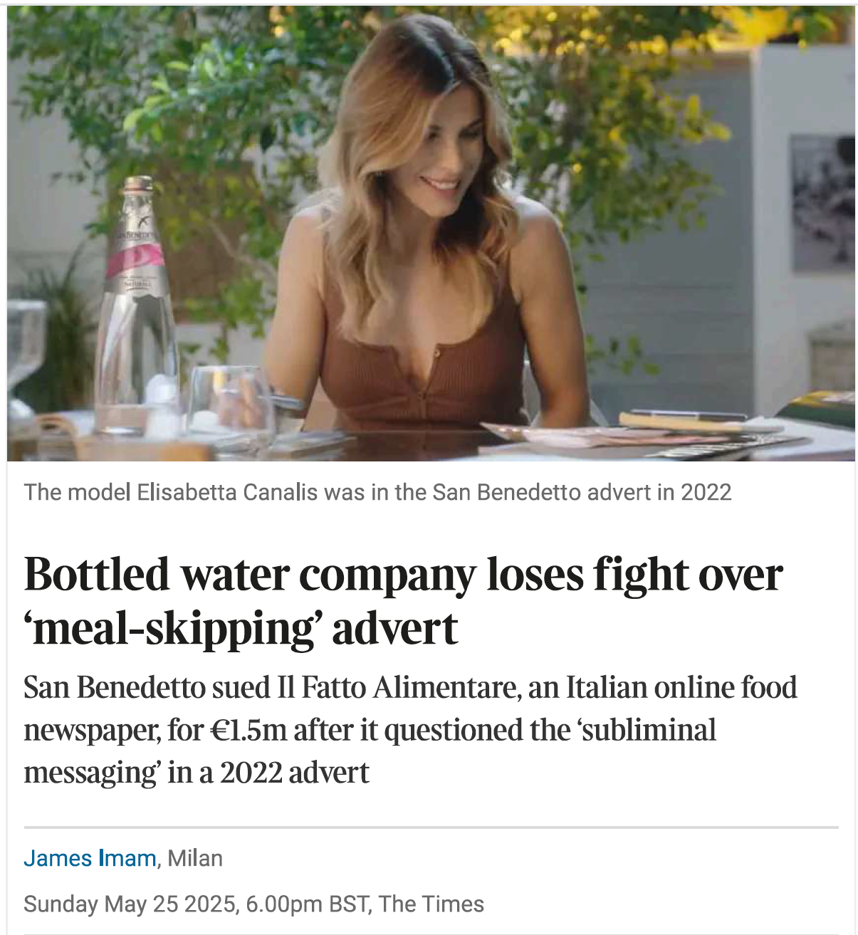 James Imam sul Times spiega che “quando il direttore di un piccolo giornale online ha criticato lo spot per aver associato la bellezza all’idea di saltare i pasti, è iniziato un contenzioso legale durato due anni. La San Benedetto, ha accusato la testata di diffamazione e ha richiesto un risarcimento di 1,5 milioni di euro”. La nota prosegue dicendo che “L’azienda nel 2022 tagliò a metà lo spot da 30 secondi, rimuovendo la scena del tostapane, ma negò pubblicamente di essere stata censurata. Citò in giudizio il sito, chiedendo la rimozione dei due articoli. Un giudice respinse la richiesta. L’azienda fece appello, ma perse di nuovo”.