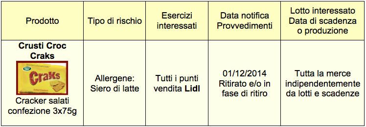Il sistema di allerta rapido della Regione Valle d’Aosta il primo dicembre ha ritirato dal commercio tutti i lotti di cracker salati Craks Crusti Croc, una delle marche commerciali della catena di supermercati Lidl (vedi dettagli nella tabella sotto).