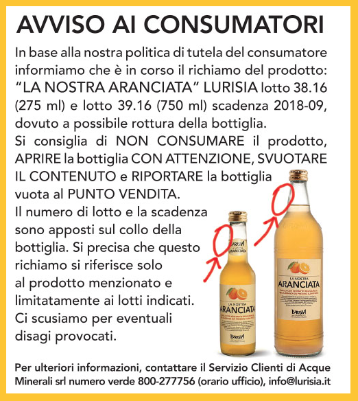 L’azienda piemontese Lurisia ha diffuso l’avviso (vedi sotto) del richiamo di un’aranciata per il rischio di rottura della bottiglia. Si tratta della bibita “La nostra aranciata” della marca Lurisia, in bottiglia di vetro da 750 ml e da 275 ml. I lotti ritirati sono esclusivamente i numeri 3916 (750 ml) e 3816 (275 ml) con termine minimo di conservazione (TMC) 09/2018, codice EAN: 8032919465146. Queste informazioni sono presenti sul collo della bottiglia.