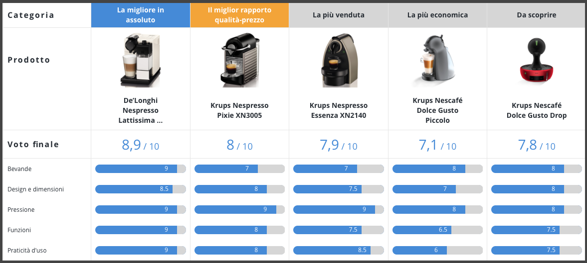Nel test sono state messe a confronto 5 modelli, di cui 4 Krups e una De’Longhi. Proprio quest’ultima con il modello Nespresso Lattissima Touch EN550 è stata valutata la migliore, in quanto soddisfa pienamente tutti i parametri. Il prezzo però è impegnativo, più di 200 euro, pari a cinque volte quello della più economica Krups Nescafé Dolce Gusto Piccolo, che ha ricevuto comunque un buon punteggio. Il miglior rapporto qualità prezzo va al modello Krups Nespresso Pixie XN3005, che con un centinaio di euro offre un buon espresso, grazie soprattutto alla potenza della pressione che arriva a 19 bar. Oltre al confronto delle 5 macchine da caffè, il sito offre una scheda dettagliata per ogni prodotto, in modo da poter scegliere la più adatta alle proprie esigenze.