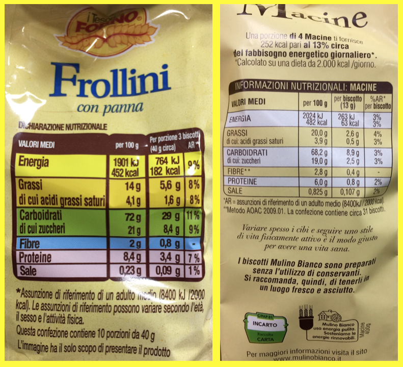L’esempio da Lei riportato costituisce la riprova di quanto sopra. Il consumatore medio, nel leggere che un prodotto contiene “meno xx% grassi saturi…”, viene indotto a credere che esso sia preferibile dal punto di vista nutrizionale rispetto a uno simile presente sullo scaffale del supermercato. E invece non è così, proprio nel caso delle Macine che contengono più grassi totali e più calorie rispetto ai biscotti frollini firmati “i Tesori del Forno”.