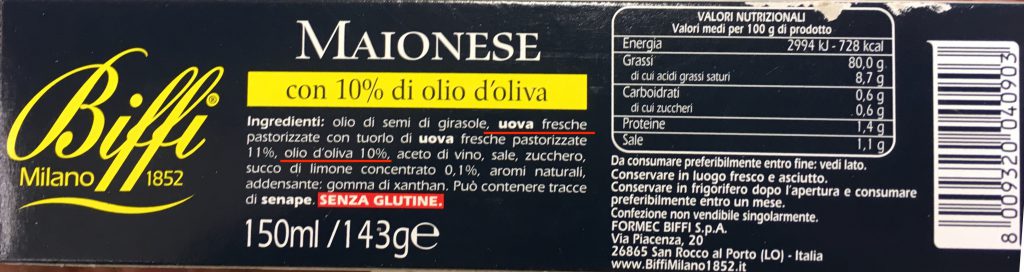 “La maionese Biffi propone un prodotto dalle caratteristiche superiori”. “La ricetta “classica” – fa sapere l’azienda – ha il 10% di olio di oliva!!! Capisco dicessero che ha Olio Extravergine di Oliva, ma Olio di Oliva? Meglio la “ricetta classica” con un dignitoso Olio di Girasole!