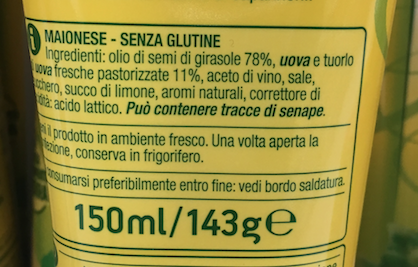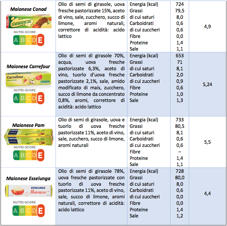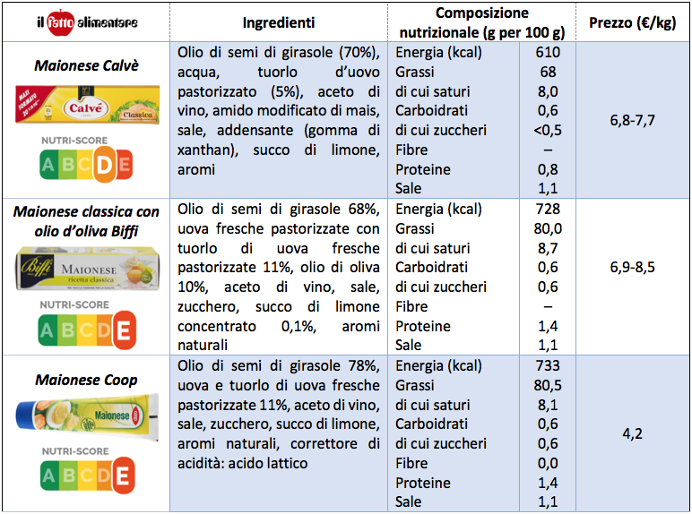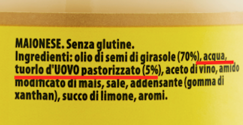 Nei vasetti di maionese a marchio Coop, Conad, Pam ed Esselunga, il primo ingrediente è l’olio di girasole, seguono le uova, in tutti i casi “fresche” (si tratta di uova di categoria A, che potrebbero essere anche vendute al dettaglio; le uova di categoria B, non possono essere definite “fresche” e sono destinate esclusivamente all’industria). In diverse ricette inoltre compaiono tuorli di uova in percentuale variabile dall’11% al 15%. A seguire, aceto, sale, zucchero, succo di limone, aromi e (in tutte tranne la Pam) acido lattico come correttore di acidità. Nella maionese Carrefour le uova si fermano all’8,4% e l’acqua è il secondo ingrediente, forse per questo è necessaria l’aggiunta di amido modificato di mais.