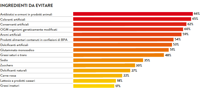Secondo l’indagine mostra il cibo è sempre più visto come uno strumento per prevenire fattori di rischio, quali ipercolesterolemia, ipertensione obesità e diabete. Un fenomeno dovuto, secondo l’amministratore delegato di Nielsen Italia Giovanni Fantasia, “all’aumento del numero di consumatori informati, ma anche al progressivo invecchiamento della popolazione”, e di conseguenza delle patologie croniche legate allo stile di vita. Si spiega così l’aumento delle vendite per gli alimenti percepiti come salutari: integratori, ma anche cibi integrali a base di soia, e alimenti senza sale, glutine o lattosio. La sensazione è che accanto alla legittima ricerca di un’alimentazione genuina ed equilibrata si affermi la tendenza a demonizzare alcuni alimenti, tendenza che le industrie sfruttano mettendo in commercio prodotti presentati come “scorciatoie” per seguire una dieta sana, ma senza rinunce. Secondo quando emerge dall’indagine, quasi due italiani su cinque riducono i consumi di grassi e carboidrati, mentre la tendenza a diminuire la quantità di zucchero è più contenuta rispetto alla media europea (9% rispetto al 22%). Un fenomeno al quale corrisponde una crescente richiesta di alimenti “senza”, secondo una tendenza che Nielsen definisce “less is more”. Il 42 % degli italiani richiede alimenti con pochi grassi o senza grassi, il 31% senza zucchero il 25% senza sale. E si tratta di un fenomeno in espansione visto che, secondo Fantasia “oggi solo il 45 % dei consumatori ritiene che i propri bisogni siano soddisfatti dall’offerta”. Ancora più preoccupante è il fatto che oggi i consumatori non si limitano a cercare alimenti genericamente più salutari ma tendono a escluderne alcuni, spesso sulla base di autodiagnosi. Dall’indagine risulta che oltre il 23 % degli intervistati (contro il 36% del campione globale) ritiene di essere allergico o intollerante a uno o più alimenti, in particolare al lattosio (8%) e al glutine (5%), dichiarando percentuali superiori a quelle riconosciute dalle autorità sanitarie.