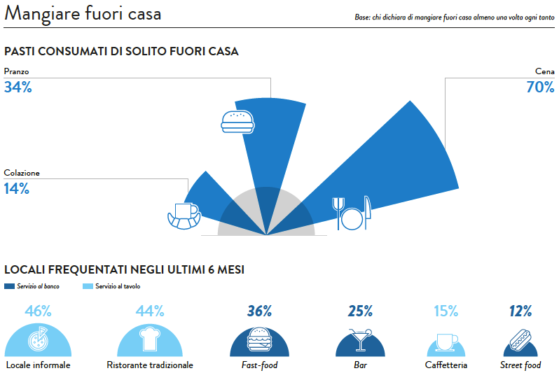 Interessante è poi il dato che si riferisce ai pasti consumati fuori casa: è vero che due italiani su tre – il 66% del campione – considerano il cibo casalingo più sano e genuino rispetto a quello consumato fuori, ma la media europea sfiora il 78%. Una differenza forse dovuta a scelte diverse: per gli italiani “mangiar fuori” significa andare al ristorante (44% contro una media europea del 31%) o al bar, mentre i fast food sono decisamente meno frequentati (36% rispetto a una media europea del 49%.)