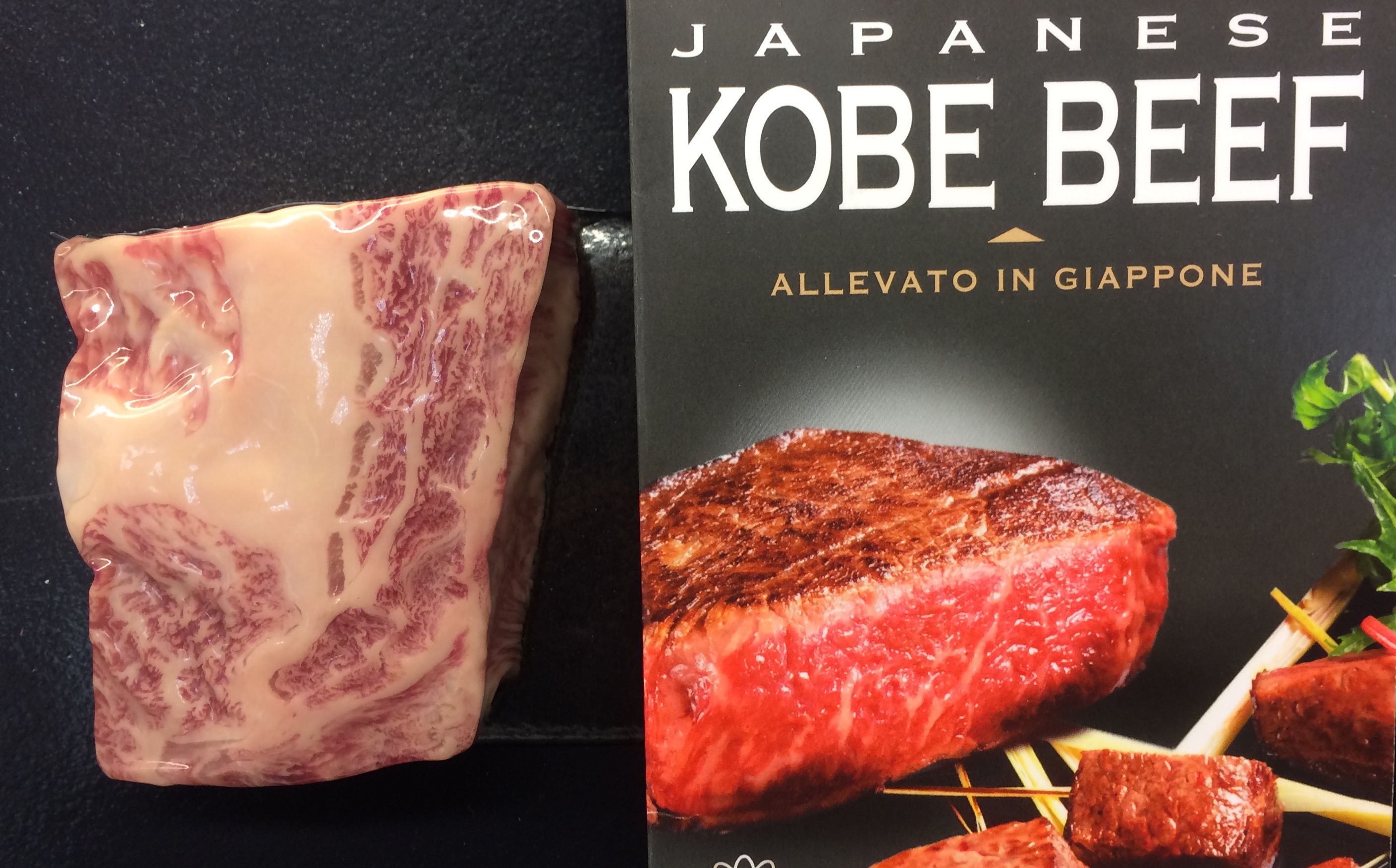 Pochi giorni fa,mentre facevo la spesa al supermercato e cercavo un taglio di carne per arrosto, mi sono imbattuta in una vaschetta di colore nero che aveva sul frontespizio una scritta in inglese molto evidente “Japanese Kobe beef”, affiancata dalla dicitura “Allevato in Giappone“. Incuriosita, focalizzo l’attenzione sulla bella foto di una bistecca al sangue sulla confezione, affiancata però da un pezzetto di carne vero (il manzo di Kobe) che a prima vista fatico ad abbinare all’immagine (vedi foto sotto). Questo perché la carne ha effettivamente ha il 50% di grasso.