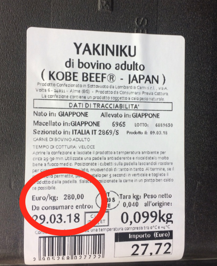 Anche le tecniche di macellazione seguono precisi standard. Sul retro della vaschetta si dice che il bovino è nato cresciuto e macellato in Giappone e poi importato in Italia da Lombardia carni dove viene porzionato. Se il sistema di allevamento è molto complesso, i consigli per cucinare sono invece estremamente semplici: in padella per 45 secondi per lato. Ma la vera sorpresa è il prezzo: 280 €/kg (8 volte di più rispetto al filetto di manzo venduto a fianco nello stesso supermercato Esselunga situato nell’hinterland milanese). Dimenticavo, il manzo di Kobe si può acquistare anche con il sistema della spesa online.