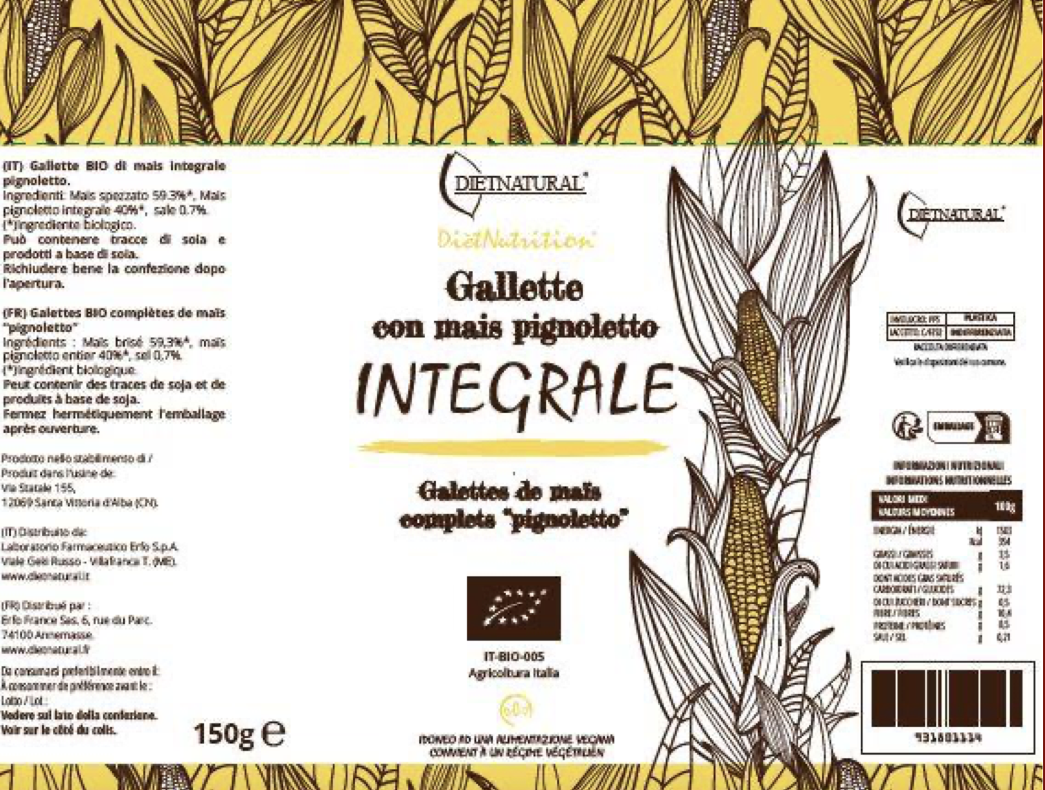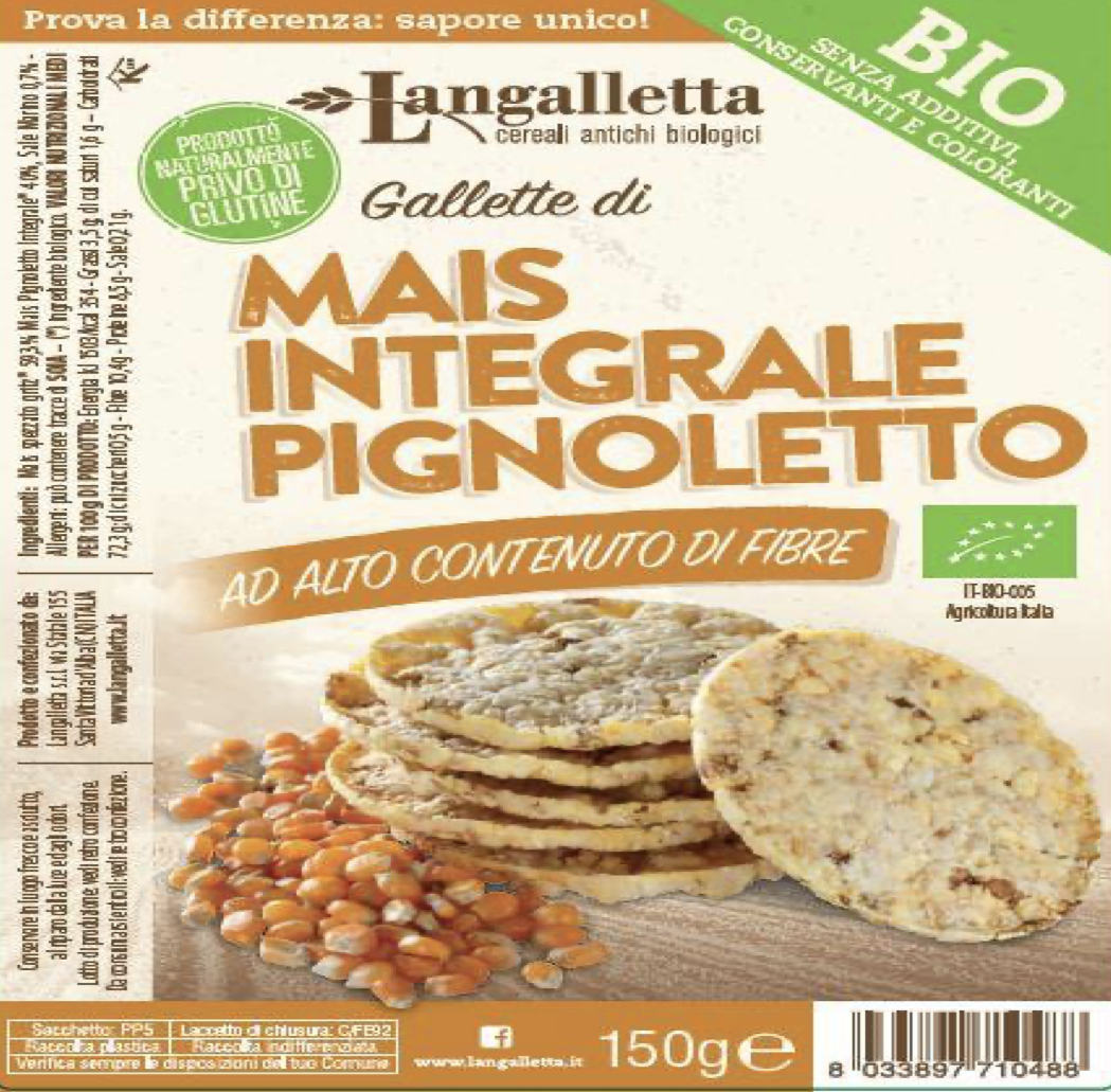 Denominazione: Gallette di mais integrale pignoletto; Confezione da 150 grammi