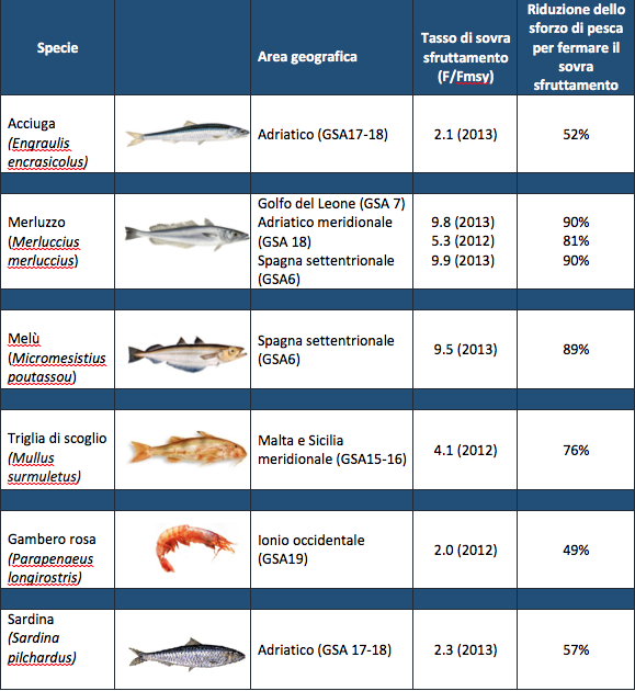 Mentre nel Nord Europa un numero crescente di stock ittici mostra segni di recupero, nel Mediterraneo la situazione è critica e si rischia di creare un danno enorme alla biodiversità. I paesi più coinvolti sono Spagna, Francia, Croazia e Italia. Le specie che hanno superato la soglia di sostenibilità sono quelle più commerciali, come: sardine, acciughe, merluzzo, triglia, melù e gambero. Tra questi, come si può leggere dalla tabella 1, il merluzzo del Golfo del Leone e della Spagna settentrionale ha il tasso di sovrasfruttamento più alto e richiede una riduzione dello sforzo di pesca del 90%. Malta e Sicilia meridionale sono invece il teatro della pesca della triglia: il tasso di sovrasfruttamento è pari a 4.1 e si richiede una riduzione dello sforzo di pesca pari al 76%. Il 91% degli stock condivisi con paesi terzi (del Mediterraneo) è sfruttato a livelli di gran lunga superiori al rendimento massimo sostenibile. Da noi la pesca commerciale intensiva nel mar Tirreno e nel mare Adriatico utilizza principalmente reti a circuizione e a strascico, e solo in misura minore reti della pesca artigianale.