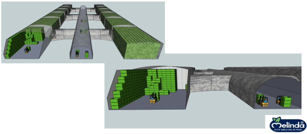 L’idea è nata nel 2010, dopo una fase di studio di modelli che riguardavano il consumo energetico, la tenuta ai gas e la qualità delle mele così conservate, oltre a una simulazione della sostenibilità economica. Alla fine si è giunti, nel 2012, alla messa a punto della prima cella prototipo. In un primo momento si pensava di sfruttare le gallerie impiegate in passato per l’estrazione di una roccia sedimentaria, la dolomia, dall’azienda Tassullo Materiali, e dismesse. Le vecchie cave però non si sono rivelate delle dimensioni adatte, le due imprese sono quindi giunte a un compromesso: i nuovi spazi (circa l’80% del totale) saranno idonei per la conservazione della frutta, e tutto il materiale estratto sarà impiegato dalla Tassullo per l’edilizia.