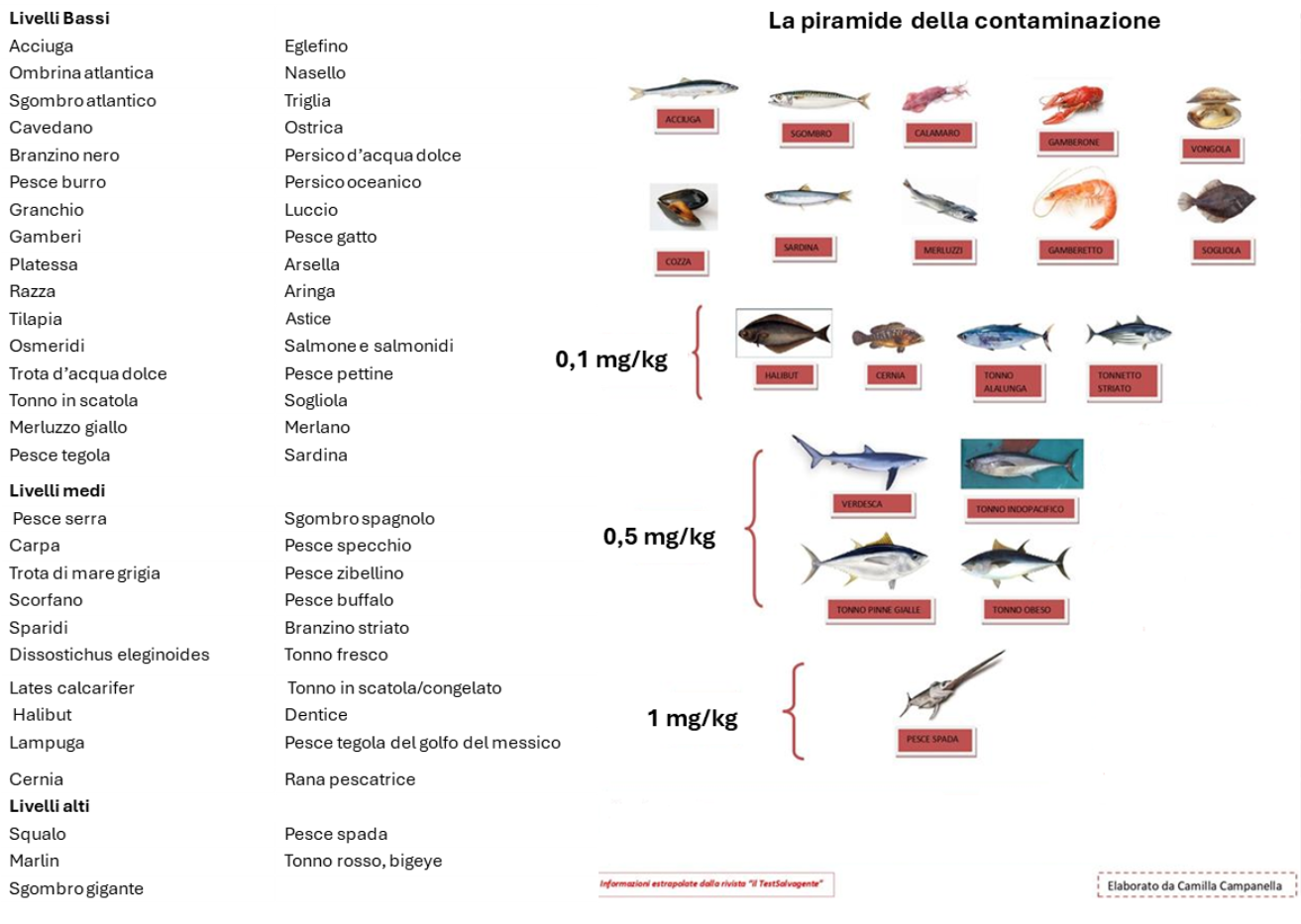 - Limitare il consumo di pesci predatori che tendono ad accumulare metilmercurio: una porzione settimanale per tonno, pesce spada, verdesca, luccio, palombo e smeriglio, massimo due per il tonno in scatola;