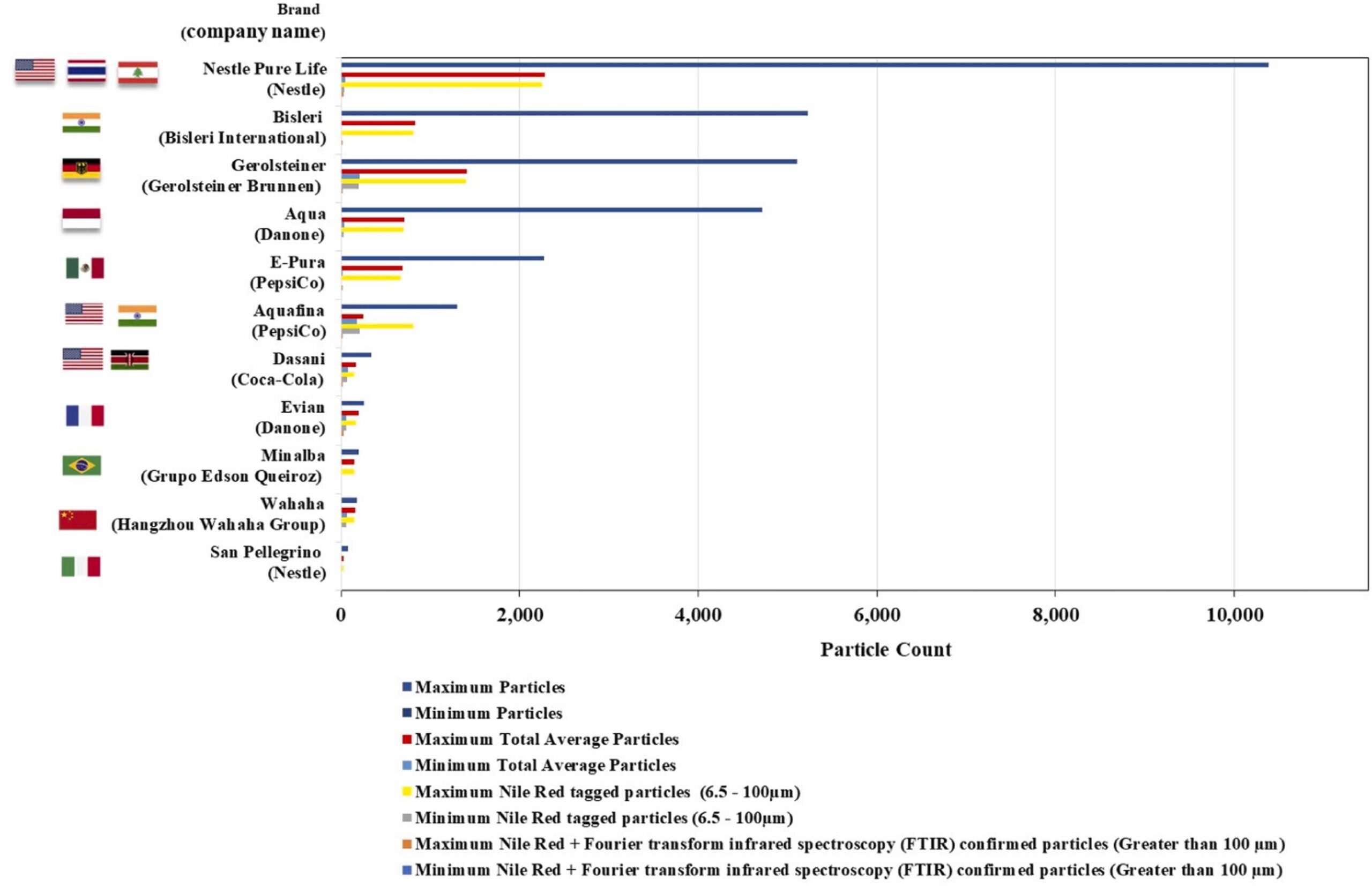 Che il settore sia caotico lo si vede da un altro dato riportato nel lavoro: la classifica delle 11 marche peggiori di acqua minerale (vedi grafico sopra), nell’ambito delle quali ci sono grandissime variazioni. Al primo posto c’è Nestlé Pure Life, con un numero totale di oltre 10mila microplastiche per litro, seguita dall’indiana Bisleri, ma Nestlé è proprietaria anche di altri marchi, tra i quali l’italiana San Pellegrino, che è la meno peggio (con circa mille microplastiche). Nel mezzo si trovano minerali di Danone, PepsiCo, Coca-Cola, con concentrazioni variabili di microparticelle.
