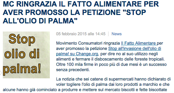 Il Movimento Consumatori ringrazia Il Fatto Alimentare e Great Italian Food Trade per aver promosso la petizione Stop all’invasione dell’olio di palma! su Change.org, per dire no al suo utilizzo negli alimenti e fermare il disboscamento delle foreste tropicali. Oltre 100 mila firme in poco più di due mesi è un successo senza precedenti. La notizia che sei catene di supermercati hanno dichiarato di voler togliere l’olio di palma dai loro prodotti a marchio e che alcune hanno già cominciato a produrre e mettere sul mercato biscotti e fette biscottate senza grassi tropicali rappresenta un incredibile risultato. Ora ci auguriamo che altri gruppi della grande distribuzione si sentano obbligati a cambiare le proprie strategie e si diffonda un risultato tanto importante per la salute dei cittadini.