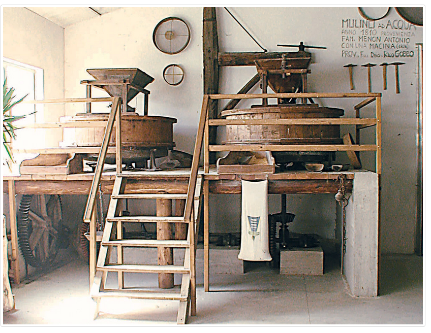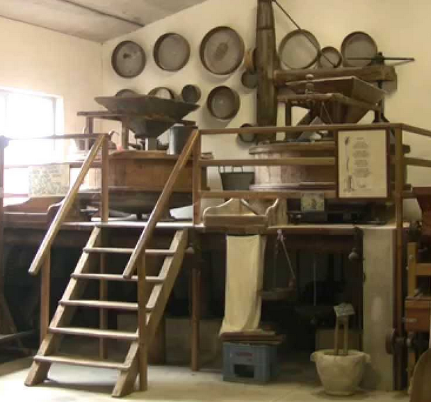 Il mulino costruito appositamente per girare gli spot di Banderas è infatti l’ottima ricostruzione di un frantoio per macinare olive. Il mulino ad acqua con le macine per schiacciare i chicchi i grano era costituito da due grandi pietre rotonde sovrapposte appoggiate su un piano orizzontale. Delle due una era fissa e l’altra mobile come detto in questo filmato proposto dal Museo della civiltà contadina di Ancona. I chicchi cadevano dall’alto e venivano ridotti in farina che, attraverso uno scivolo, veniva raccolta nei sacchi. In molte strutture le macine in pietra erano poco visibili essendo racchiuse in una “cassa” di legno.