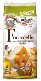 Farina di grano tenero tipo ” 0 “, acqua, olio extravergine d’oliva (8,7%), margarina vegetale (grasso di palma, acqua), lievito naturale, sale, lievito madre essiccato (farina di grano tenero fermentata, acqua), addensante: fibra di guar, glutine di frumento, emulsionanti: mono e digliceridi degli acidi grassi, farina di orzo maltato, aroma. Trattato con alcool etilico in superficie.