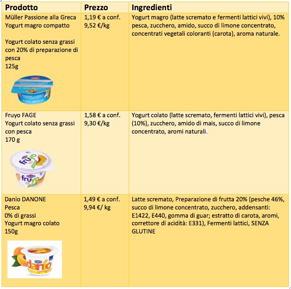 Considerando Passione alla Greca Müller al gusto Pesca, presentiamo in tabella un confronto con altre marche da tempo presenti sulmercato: Fruyo Fage, Danio Danone e Delta Yomo. Gli ingredienti sono gli stessi per Fruyo, Delta e Müller. Tutti hanno almeno un addensante, stabilizzante o emulsionante. In Müller e Fruyo si tratta di amido, nello yogurt Delta all’amido si aggiunge la pectina, mentre per Danio gli addensanti e stabilizzanti sono tre: E1422 (adipato di amido acetilato), E440 (pectina), gomma di guar.