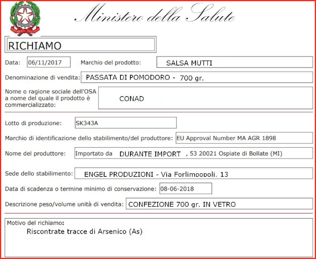 Ad ulteriore conferma di quanto scritto dal nostro sito anche il Ministero della salute ha pubblicato un comunicato, in cui annuncia che su vari social network (Facebook, WhatsApp) circolano falsi richiami di prodotti alimentari e cita come ultimo esempio quello della ditta Mutti S.p.A. e del lotto di passata di pomodoro per presenza di arsenico.