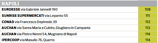 L’inchiesta di Altroconsumo sui supermercati italiani – che ha analizzato 885 punti vendita in tutta Italia – mette al primo posto per la città di Napoli (e hinterland) l’Euroesse di Via Gabriele Jannelli, con 108 punti e un risparmio – rispetto al più caro – di 10o0 euro circa. Al secondo posto troviamo Sunrise Supermercati di Via Lepanto 55 con 111 punti (più caro del 4% circa) . Medaglia di bronzo per Conad di Via Francesco Depinedo 39 dove la spesa costa il 5% in più.
