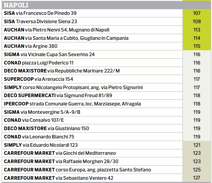 (*) Altroconsumo assegna il valore 100 al supermercato più conveniente tra i 909 visitati nell’inchiesta, e attribuisce a tutti gli altri valori superiori. A Napoli, per esempio, l’indice 107 attribuito al punto vendita Sisa di via Francesco da Pinedo indica che i prezzi sono i più convenienti della città (anche se risultano del 7% più cari rispetto al supermercato più economico Super Rossetto a Verona). Il valore 127 attribuito all’ultimo in classifica indica che la spesa costa il 20% in più rispetto al primo classificato di Napoli.