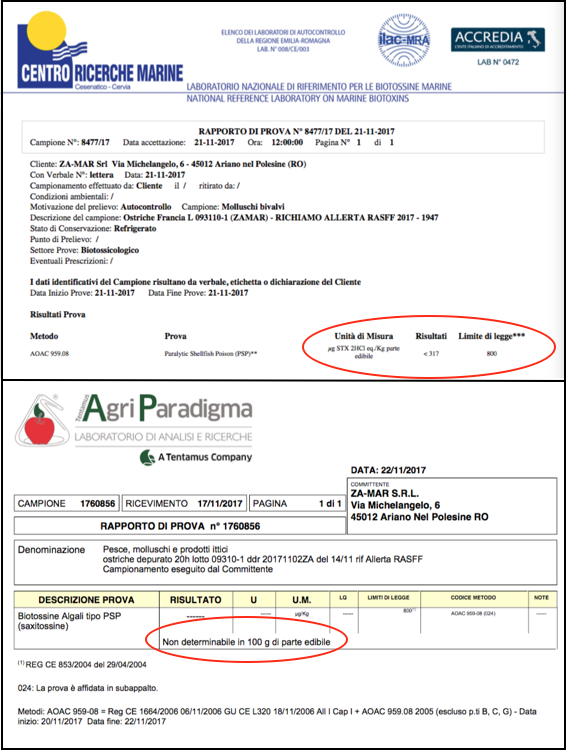 Le analisi, che sono state eseguite da due distinti laboratori (AgriParadigma di Ravenna e Centro Ricerche Marine di Cesenatico), hanno rilevato in entrambi i casi livelli di PSP al di sotto dei limiti di legge.