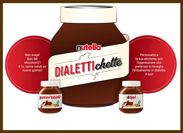 Da circa un mese la Ferrero ha lanciato, con lo slogan “Nutella parla come te”, il progetto ‘dialetti’. L’idea è di personalizzare i barattoli con 135 diverse frasi dialettali, scherzose o legate al buongiorno, scelte con l’aiuto di un team di linguisti coordinati da Francesco Avolio dell’Università degli studi dell’Aquila.