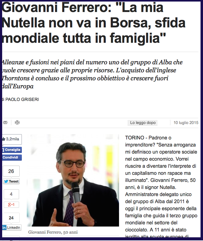 Sabato 10 luglio 2015 in un’intervista pubblicata sulle pagine del quotidiano la Repubblica e sul sito Giovanni Ferrero (amministratore delegato unico della Ferrero), descrive le prospettive di mercato e le nuove acquisizioni dell’azienda piemontese. Nell’intervista il giornalista Paolo Griseri fa una domanda su Ségolène Royal che invitava a non mangiare la Nutella per combattere la deforestazione provocata dalle coltivazioni di olio di palma. Ferrero prima dice che la sua azienda ha fatto molto sulla tracciabilità dei prodotti e nel rapporto con le popolazioni delle località di produzione, e spiega che il loro welfare viene esteso il più possibile ai collaboratori nei paesi di produzione delle materie prime. Fin qui tutto bene, la sorpresa arriva con la risposta alla domanda successiva “Queste scelte eviteranno la deforestazione per utilizzare l’olio di palma negli alimenti?”