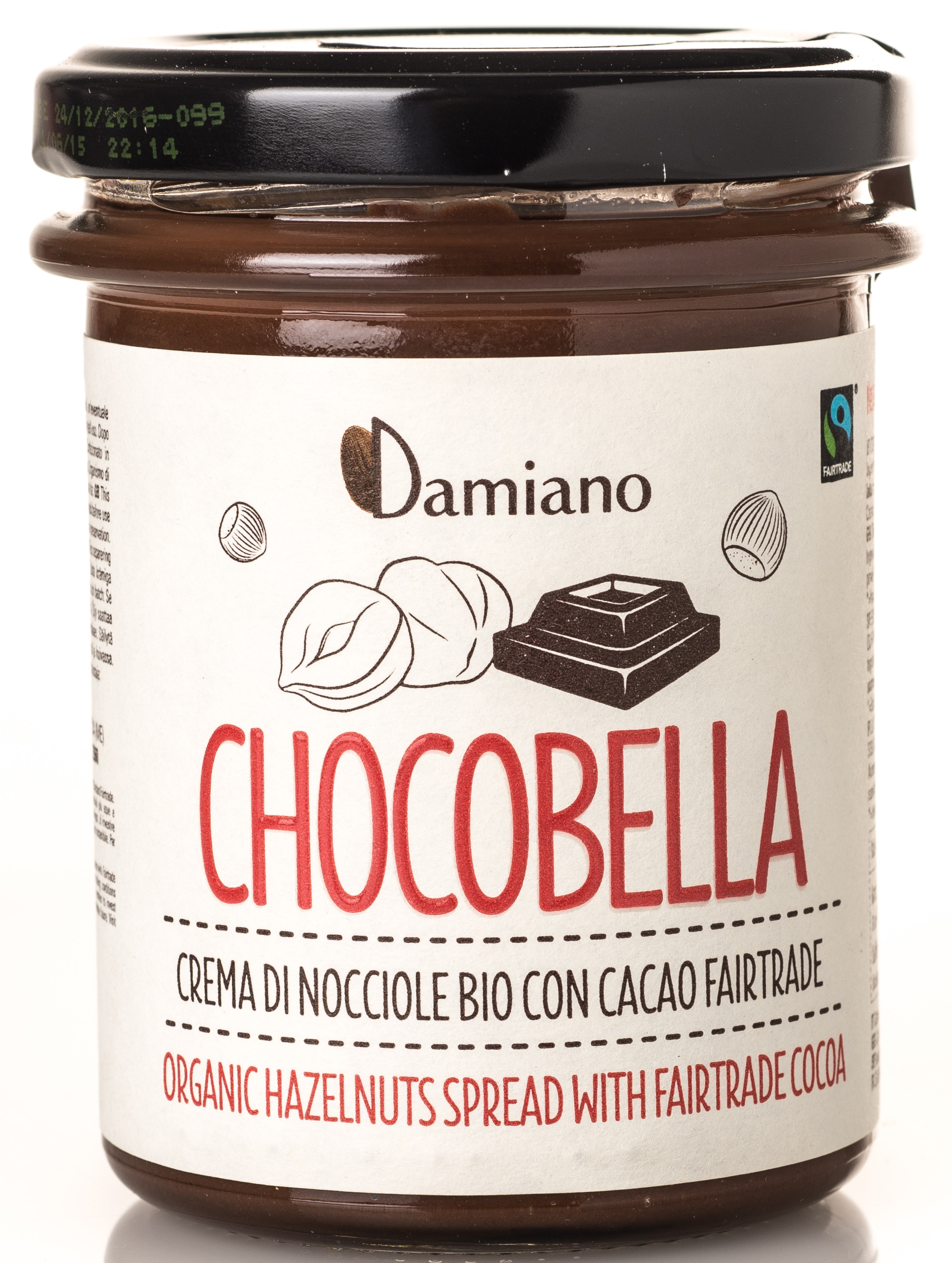 Damiano, Chocobella, Crema spalmabile alle nocciole e cacao senza olio di palma. Ingredienti: zucchero di canna grezzo, pasta di nocciole tostate 19%, cacao in polvere, latte scremato in polvere, olio di semi di girasole, pasta di mandorle pelate tostate. Prodotto certificato BIO, FAIRTRADE. |