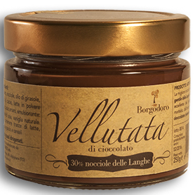 Borgodoro, Vellutata di cioccolato con il 30% di nocciole delle langhe. Ingredienti: zucchero, nocciola, cacao amaro, olio di girasole, latte scremato in polvere, massa di cacao. Emulsionante: lecitina di soia. Estratto naturale di vaniglia. Senza grassi idrogenati. Senza olio di palma. |