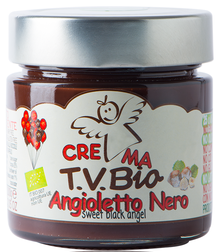 TVB, Crema spalmabile bio alle nocciole Angioletto Nero. Ingredienti: Zucchero di canna*, Cacao in polvere* 25%, Olio di Girasole*, Pasta di Nocciole* 11%, Burro di Cacao*. * ingrediente biologico |