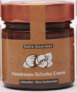 Dalia Gourmet, Crema di nocciole e cacao. Ingredienti: Nocciole tostate 66 % (provenienza Italia), dolcificanti (eritritolo, glicosidi steviolici), cacao 6 %. |