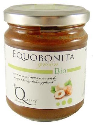 Equobonita Green Bio, Crema con cacao e nocciole. Ingredienti: nocciole (45%)*, zucchero di canna*, cacao magro in polvere* (6%), burro di cacao*. *Ingredienti da agricoltura biologica |