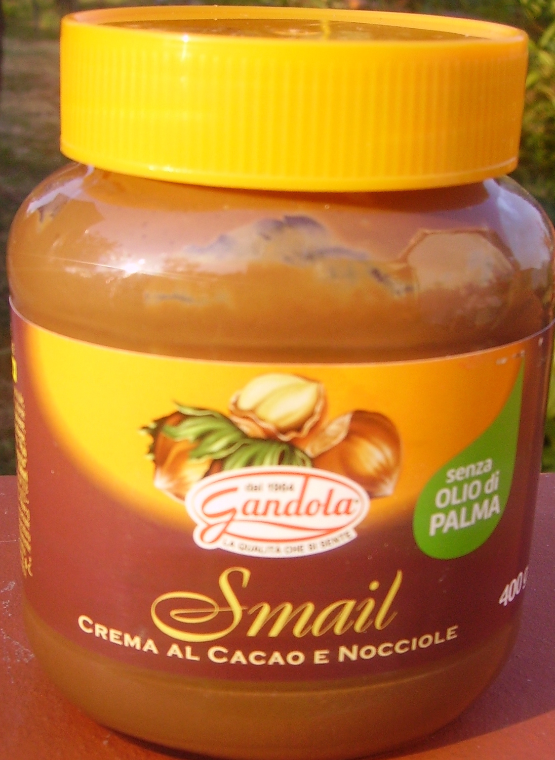 Gandola, Smail, Crema al cacao e nocciole. Ingredienti: zuccheri, olio di girasole, nocciole (13%), cacao magro in polvere (7%), lattosio, siero di latte in polvere, burro di cacao, latte scremato in polvere, emulsionante: lecitina di soia; aromi. |