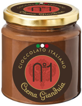 Cioccolato italiano, Crema Gianduia. Ingredienti: Nocciole Piemonte IGP (39%), Cacao in polvere, Latte in polvere, Zucchero, Emulsionante: Lecitina di soia (OGM free). |