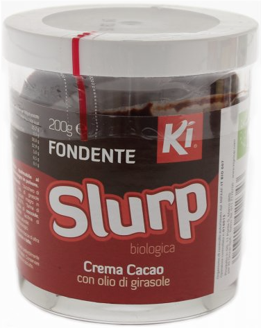 Ki Group, Slurp, Crema cacao fondente biologica. Ingredienti: *zucchero di canna, *olio di girasole (19,4%), *cacao magro in polvere (16,2%), *farina di soia, *pasta di nocciole, emulsionante: lecitina di soia, aroma naturale. |