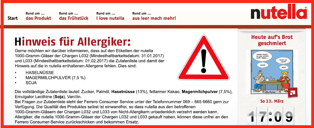 I consumatori allergici a: nocciole, latte e soia sono invitati a non consumare la crema. L’azienda ha messo a disposizione un numero verde e invita i consumatori allergici a restituire il prodotto che nel frattempo è stato ritirato dagli scaffali dei punti vendita. L’annuncio è stato rilanciato anche dal sito dell’’Ufficio federale della sicurezza alimentare tedesco. Il problema sembra riguardare solo i lotti distribuiti in Germania.
