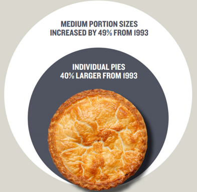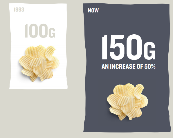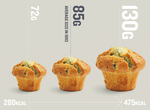 Un altro dato evidenziato è il costante incremento delle porzioni dei prodotti industriali rispetto al passato. Per dimostrare questa tesi i ricercatori hanno citato un rapporto diffuso lo scorso anno dalla British Heart Foundation, confrontando il peso di alcuni prodotti venduti da quattro grandi catene di supermercati inglesi – Sainsbury’s, Tesco, Asda e Morrisons – nel 1993 (anno a cui fanno riferimento le ultime rilevazioni governative) e nel 2013 (con indagini condotte direttamente nei punti vendita). Le foto parlano chiaro. Tutti i 12 prodotti presi in esame presentano porzioni decisamente più abbondanti rispetto a vent’anni fa. Nel caso dei muffin il peso e l’apporto energetico (da 280 a 475 chilocalorie) sono quasi raddoppiati (da 85 a 130 grammi). La stessa cosa vale per i bagel, dolci d’origine ebraica consumati a colazione: da 70 a 86 grammi. Anche le dimensioni di una torta di pollo (piatto unico inglese) risultano incrementate del 40%, infine è anche aumentato del 50% il contenuto di un sacchetto di patatine. Ecco anche perché i bambini oggi sono più grassi che in passato.