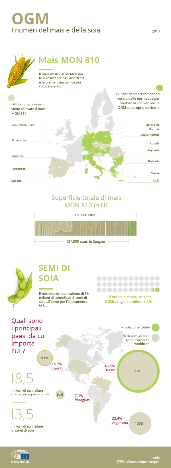 Sul sito del Parlamento europeo è stato pubblicato in questi giorni una breve sintesi dal titolo: OGM: tutto quello che c’è da sapere. Di seguito lo riproponiamo con l’infografica sui numeri di soia e mais (vedi sotto).