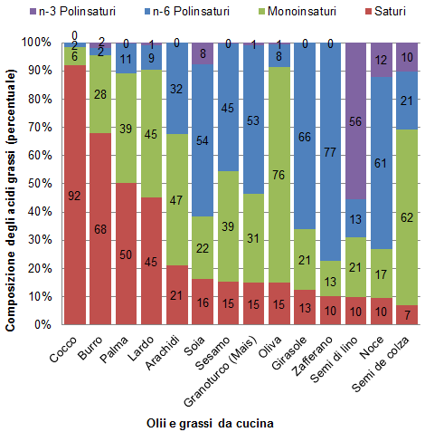 Tabella di composizione degli acidi grassi di vari oli e grassi vegetali e animali