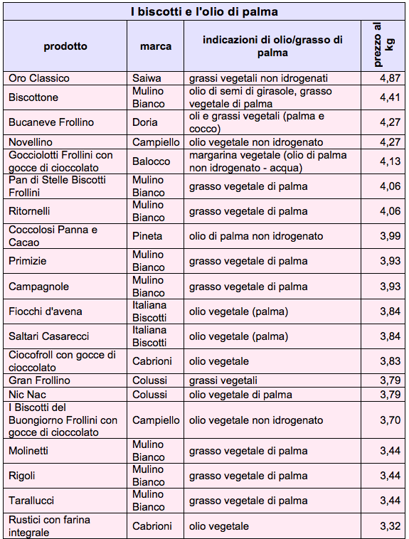 Condivido in pieno questa indagine perché anche io ho notato questa diffusa presenza dell’olio di palma nella composizione di quasi tutti i biscotti presenti sul mercato. Vorrei fare una ulteriore segnalazione: anche tra gli ingredienti dei biscotti Plasmon (indicati per un consumo a partire dal sesto mese di vita di un bambino) compare l’olio di palma assieme all’olio di oliva.