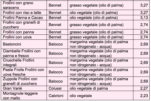 L’ampio assortimento fornito dal punto vendita ci ha permesso di confrontare ben 100 prodotti, escludendo i dietetici e non considerando le differenze di formato. Il risultato è stato sorprendente: nel 94% dei biscotti nella lista degli  ingredienti si riscontrano “oli e grassi vegetali”. Si tratta di una terminologia generica,  ammessa sulle etichette sino al 14 dicembre di quest’anno ( dopo dovrà essere dichiarato in modo chiaro il tipo di grasso) utilizzata nella stragrande maggioranza dei casi per non citare in modo esplicito l’olio di palma. Soltanto sei prodotti non utilizzano grassi vegetali, uno di questi è Pavesini che non contiene grassi, mentre gli altri  impiegano burro (vedi tabella 1 sotto).
