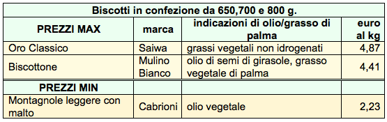 L’olio di palma è quindi sicuramente un ingrediente fondamentale nei biscotti ma non solo visto che si trova in molti prodotti da forno. A questo punti ci siamo chiesti se e quanto incide sul prezzo la scelta del palma rispetto ad altri  grassi alimentari più nobili come il burro, il burro di cacao … Essendo importante anche il formato (la grammatura) e la confezione, il confronto tra i prezzi è avvenuto considerando frollini e biscotti secchi in sacchetto o astuccio nelle confezioni da 650, 700 e 800 grammi.