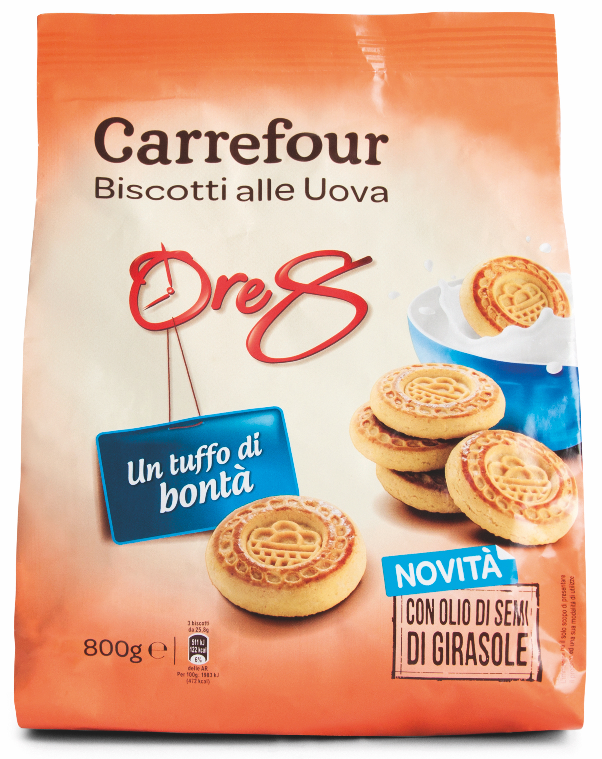 Carrefour, Biscotti alle Uova. Ingredienti: farina di frumento, zucchero, olio di semi di girasole 16,6%, uova 5,5 %, latte intero pastorizzato, agenti lievitanti (carbonato acido di sodio, carbonato acido di ammonio, tartrato monopotassico), sale, sciroppo di fruttosio, proteine del latte, miele, antiossidante: estratto di rosmarino. Può contenere tracce di soia e frutta a guscio. |