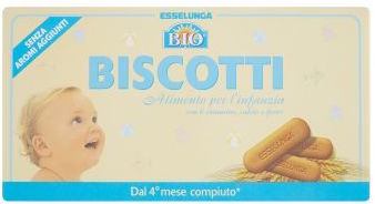 Selex Primi Anni: Biscotti per l’infanzia biologici. Ingredienti: farina di frumento*, zucchero di canna*, olio extravergine di oliva*, amido di frumento*, burro*, estratto di malto d’orzo*, agenti lievitanti (carbonato acido di ammonio, carbonato acido di sodio, tartrato monopotassico), aroma naturale di vaniglia, vitamina B1. *Biologico. Contiene glutine. Può contenere tracce di uova, latte, nocciole e altra frutta a guscio. |
