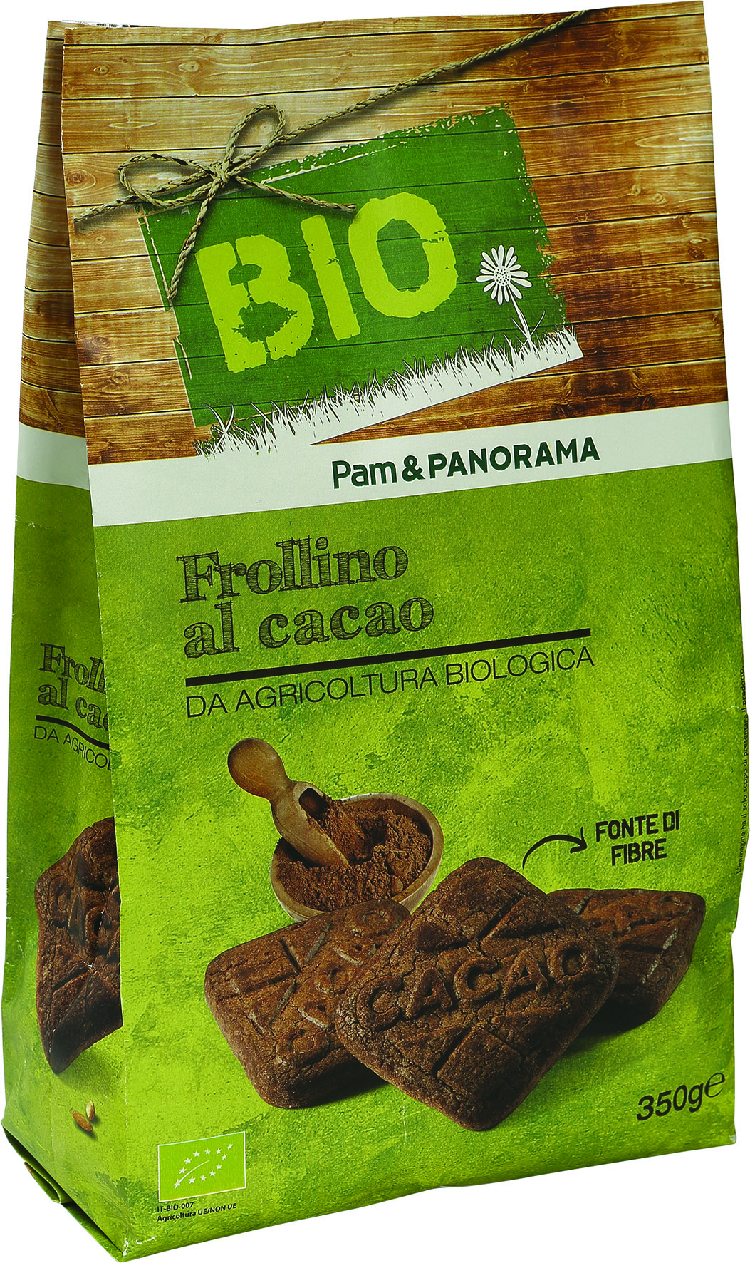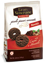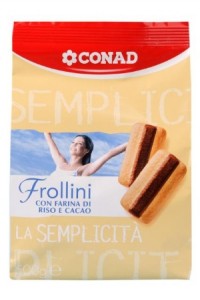 Conad, Frollini con farina di riso e cacao. Ingredienti: farina di frumento, zucchero, uova, olio di mais, cacao in polvere 4%, farina di riso 3,6%, proteine del latte, latte scremato in polvere, agenti lievitanti: carbonato acido di sodio, carbonato acido di ammonio; emulsionanti: lecitine (di soia); sale, aromi. Può contenere tracce di frutta a guscio |